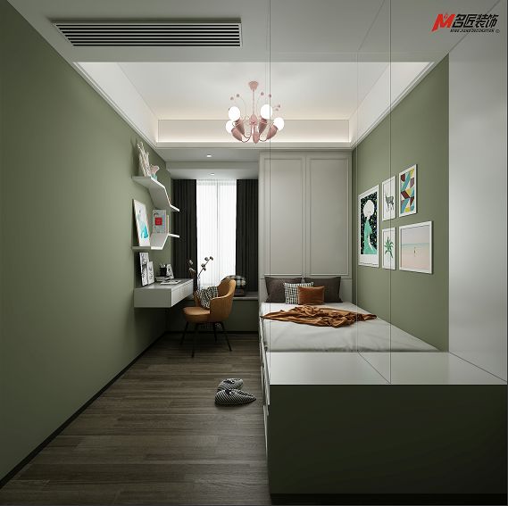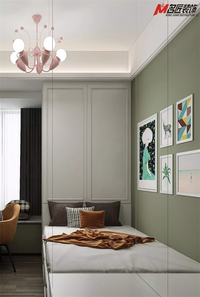 鶯色綠兒童房墻面,用上柔調的粉色燈具,以組合形式的裝飾畫為空間的視覺中心,色彩簡單明快。簡約線條造型書架,既可以裝飾也可歸置物件,不同飽和度不同明度的顏色與花紋相互交叉融合,活潑而不繁雜。