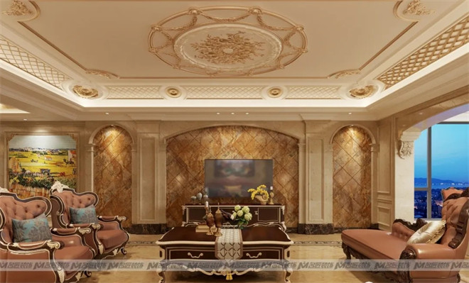 客廳的墻面大面積地使用米黃色系的石材來裝飾,與大理石拼花的地面相映成輝,石材天然的紋理使空間多了一份自然純粹。深色的皮質沙發是客廳的主角,古樸典雅,藝術感濃厚。不僅帶來感官上的平衡舒適,更帶有莊重感。暖黃色的燈光在石材的反射下,整個空間流光溢彩,華貴絢麗。