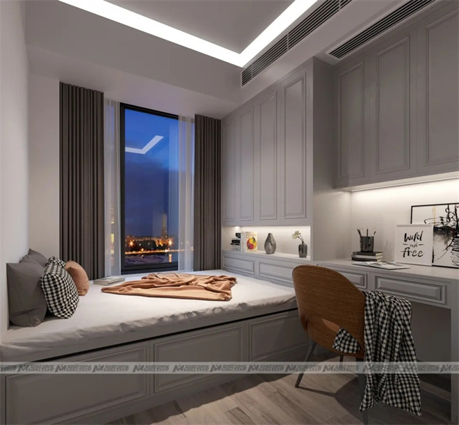 長輩房的設計風格偏向現代簡約,整體呈現自在平和的舒適氛圍,以白色作為主要色調,明亮干凈,給老人創造一個樂觀積極的居住環境。