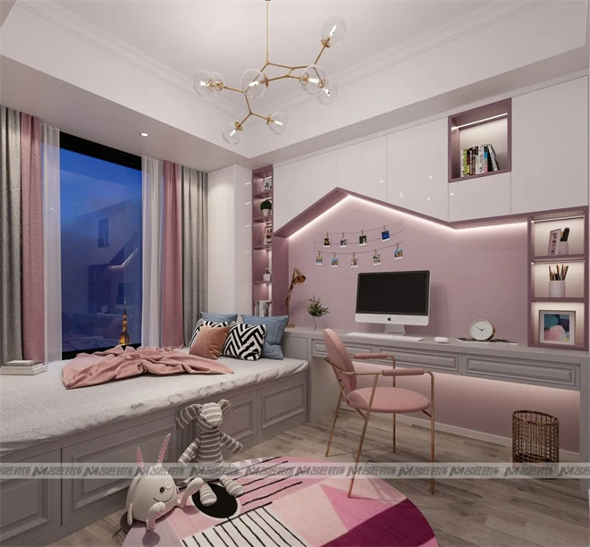 粉色大概是每個寶藏女孩都無法抗拒的顏色了,其自身夢幻浪漫、甜蜜柔美的氣質尤為吸引人。粉色的墻體與定制化的白色書柜相結合,滿足了收納與學習需求,照片墻滿載著小女孩美好的回憶。
