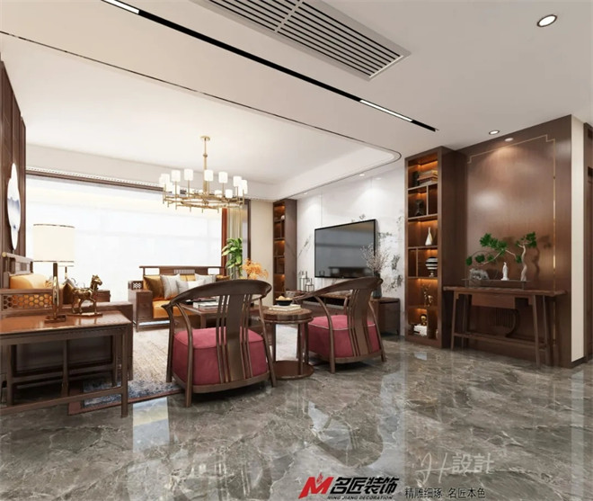 整個開放式的空間極具開放性,在簡潔的基調上,利用現代和新中式風的家具、燈具及飾品裝飾出新古之韻的雅宅。