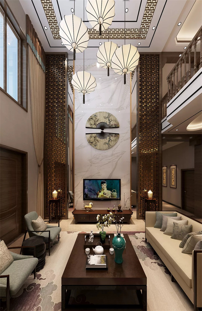 兩層樓高的客廳大氣磅礴,前后結構對稱,不同造型的新中式燈具加上巨幅山水畫。客廳空間非常開闊,四面通透,中式的大圓桌象征了一家人和和美美