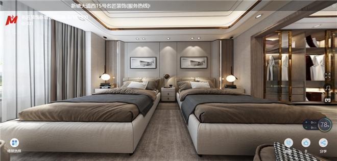 本案用材方面大量應用了爵士白、銀白龍、古堡灰三色大理石,房門和地板的顏色采用了淺啡色飾面,窗簾和硬包的選擇也是以啡色和灰色來進行和硬裝的融合,這樣的組合讓整個空間在視覺上不會顯得太過冰冷,讓人既可以欣賞到黑白色三冷色帶來的輕度奢華又可以感受到軟裝帶給我們的“暖”。